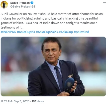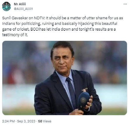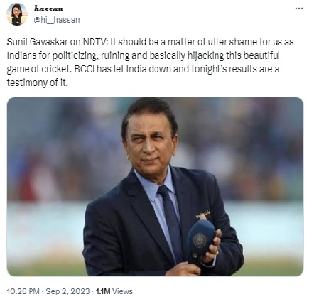 Several social media users are circulating a purported quote of Indian cricketing legend Sunil Gavaskar to NDTV, where he is apparently criticising BCCI’s mismanagement of the ongoing Asia Cup 2023.The much-anticipated India versus Pakistan game in Pallekele, Sri Lanka, which was washed out on Saturday, drew a lot of criticism over the Asia Cup schedule, with former Pakistan Cricket Board chief Najam Sethi taking a jibe at the BCCI for choosing politics over cricket.