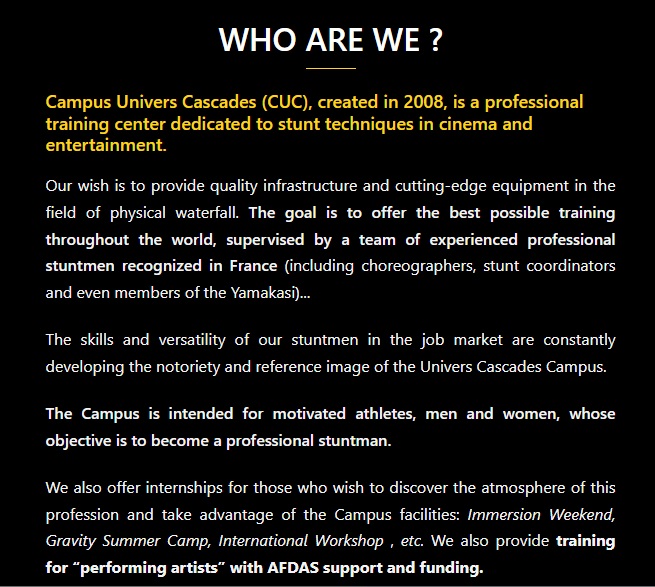 “Campus Univers Cascades (CUC), created in 2008, is a professional training center dedicated to stunt techniques in cinema and shows,” the website reads.