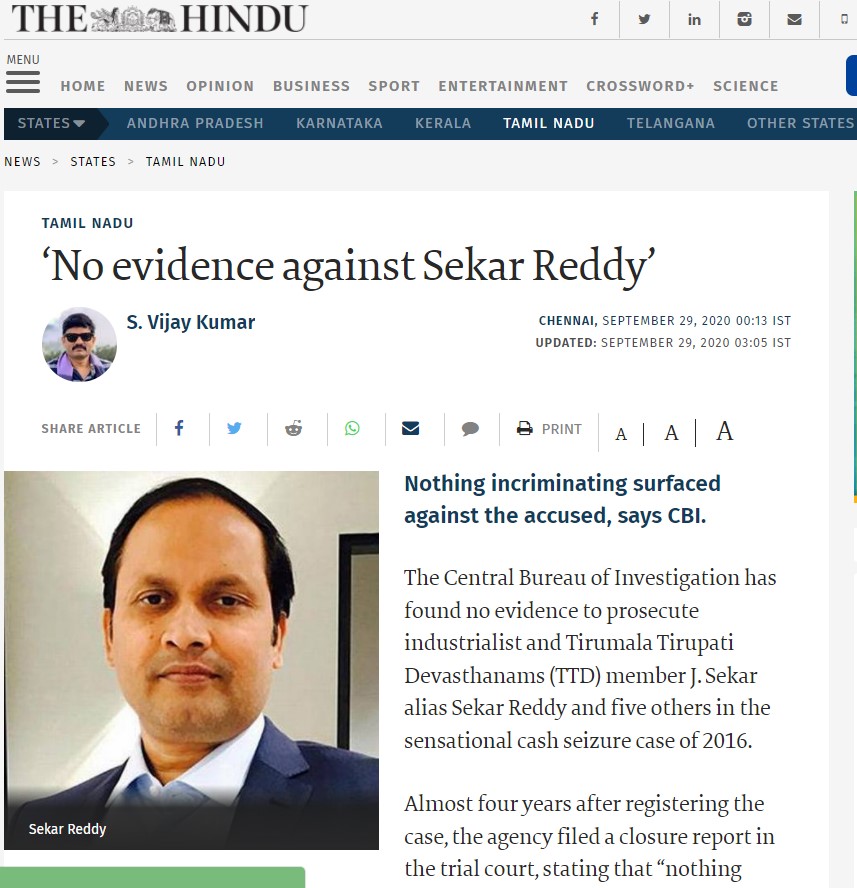 According to a report by The Hindu, dated September 29, 2020, “The Central Bureau of Investigation has found no evidence to prosecute industrialist and Tirumala Tirupati Devasthanams (TTD) member J. Sekar alias Sekar Reddy and five others in the sensational cash seizure case of 2016. Almost four years after registering the case, the agency filed a closure report in the trial court, stating that “nothing incriminating surfaced” against the accused persons.”