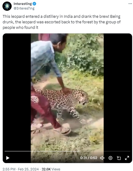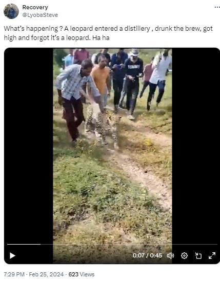 Villagers harass leopard intoxicated after drinking brew from a distillery.