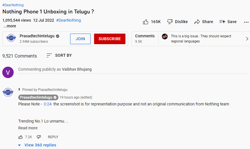 Newschecker checked the comments for the authenticity of this letter and found that the Youtuber Prasadtechintelugu had pinned a comment in the comments section with a disclaimer which said “Please Note – 0:24 the screenshot is for representation purpose and not an original communication from Nothing team”.