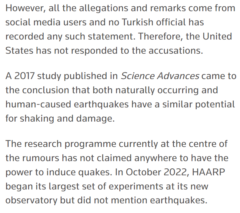 “There are no credible or possible linkages between the high-frequency active auroral research programme (HAARP) and the causation of earthquakes of any magnitude, including the most recent tragic 6 February 2023 earthquake in Turkey. HAARP is a research programme devoted to studying the ionosphere, which is part of the Earth’s upper atmosphere (about 48 to 965 km above sea level). There is no known physical mechanism possible where the HAARP could have caused the earthquakes, and any claims of such linkages fall well outside the scope of the natural sciences. Any advocates of such linkages, such as conspiracy theorists, should be ignored and their claims treated as false news”, the study reads.