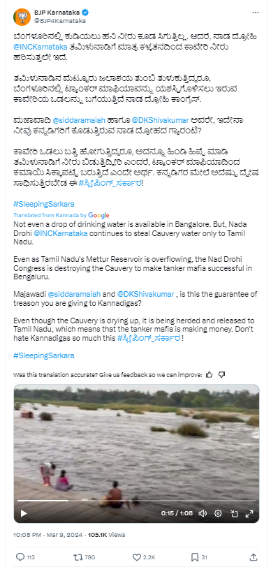 In a tweet, dated March 9, 2024, Karnataka BJP Leader CT Ravi claimed that the state government is releasing Cauvery water from KRS Dam to Tamil Nadu. Adding, “This shocking move by the State government is happening when Bengaluru and other areas dependent upon Cauvery water are struggling due to water shortage.”