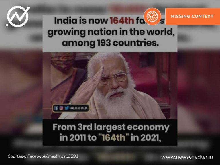 An image showing the photo of PM Modi, with the claim that India fell from being the 3rd largest economy in 2011 to the 164th fastest-growing nation in 2021, is going viral on social media platforms. Several users who shared the image criticised the government for this steep fall of the economy. Newschecker found the claim to be misleading. Read more here.