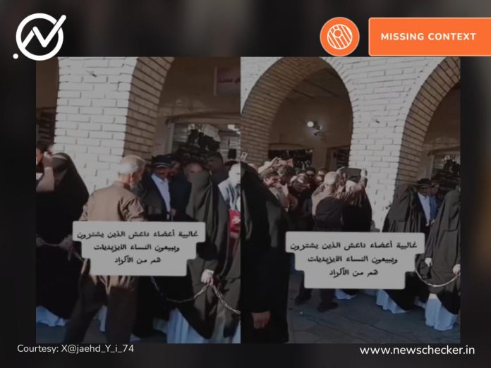 A video showing several burqa-clad women chained together standing motionless in a crowded place, while an elderly man lifts their veil one-after- another, seemingly inspecting them, is going viral online. Those sharing the clip claim that it shows ISIS selling Yazidi “women and girls in slavery markets in Iraq and Syria!” Newschecker found that the video does not show an actual incident, but an art performance and has been shared out of context. Read our full fact check here.