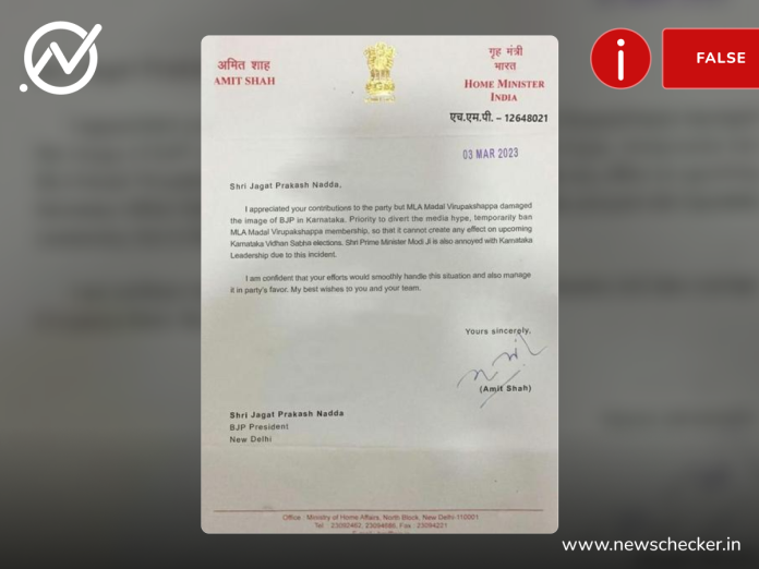 A letter purportedly written by Union Home Minister and BJP leader Amit Shah to party President JP Nadda seeking a “ temporary ban” on the party’s Karnataka MLA, Madal Virupakshappa to “divert the media hype” amid bribery row has surfaced on social media platforms. The letter allegedly written by Shah further states, “Shri Prime Minister Modi Ji is also annoyed with Karnataka Leadership due to this incident.” Newschecker found the letter to be fabricated. Read more here.