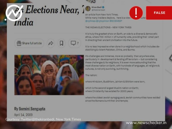 A purported New York Times article, praising India and its elections, has gone viral on social media, amid the third phase of the 2024 Lok Sabha elections taking place across 93 seats in 12 states and union territories on May 7 (Tuesday). Newschecker’s investigation revealed that the viral ‘article’ is actually a comment by a reader, posted under a New York Times article, dated April 14, 2009. Read more here.