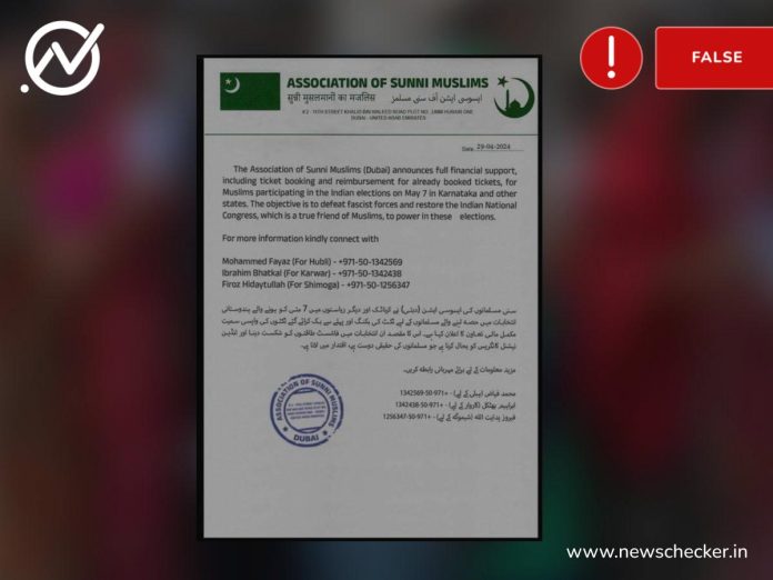 Several social media users are sharing a circular, purportedly issued by an “Association of Sunni Muslims”, based in Dubai, announcing “full financial support” in arranging for flights so that Muslims from Karnataka and other states can vote in the ongoing Lok Sabha elections to defeat “fascist forces” and bring the Congress back to power. Newschecker found that the viral notice announcing “ full financial support” to Muslim voters to restore the Congress party to power in the 2024 general elections is fake. Read more here.