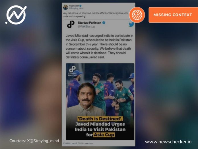 Several social media users are sharing an alleged quote by former Pakistani cricket captain Javed Miandad, inviting the Indian cricket team to play in Pakistan this year by saying there should be no concerns over security as “death will come when it is destined,” evoking reactions of ridicule and surprise. Newschecker found that Javed Miandad made these remarks last year, while speaking about India’s refusal to tour Pakistan for the Asia Cup 2023. Read more here.
