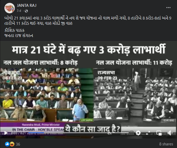 ફેસબુક યુઝર JANTA RAJ દ્વારા 10 ફેબ્રુઆરીના આ વીડિયો “બોલો 21 કલાકમાં નવા 3 કરોડ લાભાર્થી ને નલ સે જલ યોજના નો લાભ મળી ગયો, 8 તારીખે 8 કરોડ હતાં અને 9 તારીખે 11 કરોડ થઈ ગયા, વાહ મોદી જી વાહ” ટાઇટલ સાથે વિડીયો શેર કરવામાં આવેલ છે.