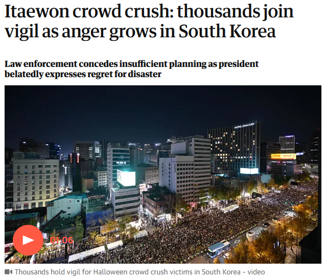 વધુમાં ન્યુઝ સંસ્થાન abc.net, theguardian અને nbcnews દ્વારા પ્રકાશિત કરવામાં અહેવાલ જોવા મળે છે. અહીંયા મળતી માહિતી મુજબ સાઉથ કોરિયાના હેલોવીન પાર્ટીમાં થયેલ દુર્ઘટનામાં 156થી માર્યા ગયેલા લોકોની યાદમાં સિઓલ, બુસાન અને જેજુ સહિત સાઉથ કોરિયાના અનેક શહેરોમાં કેન્ડલ માર્ચ યોજવામાં આવી હતી.