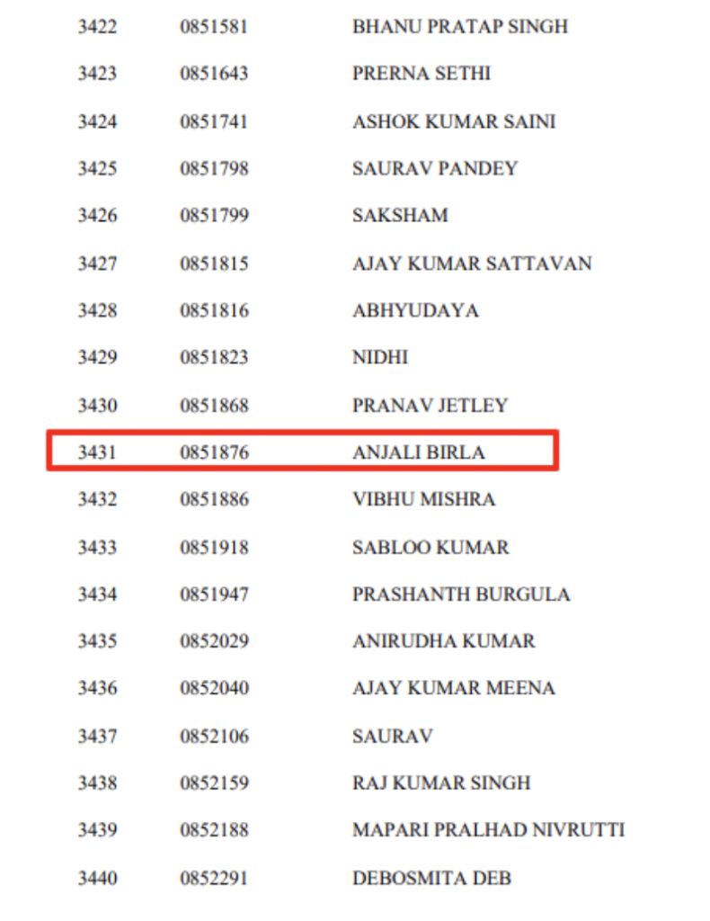 ઉપરાંત NDTVના વર્ષ 2021ના અહેવાલ અનુસાર, 4 જાન્યુઆરીએ UPSC એ પરીક્ષા પાસ કરનાર 89 ઉમેદવારોની યાદી જાહેર કરી હતી. જેમાં અંજલિ બિરલાના નામનો ઉલ્લેખ છે.