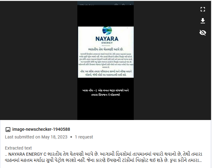 નાયરા પેટ્રોલિયમ દ્વારા જાહેર ચેતવણી આપવામાં આવી હોવાનો દાવો તદ્દન ભ્રામક છે. નાયરા એનર્જી દ્વારા વાયરલ મેસજે ભ્રામક હોવાની સ્પષ્ટતા કરવામાં આવેલ છે. ઉપરાંત આ પ્રકારના વાયરલ ભ્રામક મેસેજ ઘણા વર્ષોથી ઉનાળાની ઋતુમાં સોશ્યલ મીડિયા પર સમયાંતરે વાયરલ થતા રહે છે.