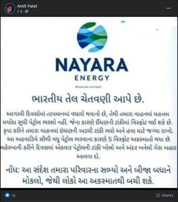 વાયરલ મેસેજમાં લખવામાં આવ્યું છે કે ” NAYARA ENERGY ભારતીય તેલ ચેતવણી આપે છે. આગામી દિવસોમાં તાપમાનમાં વધારો થવાનો છે, તેથી તમારા વાહનમાં મહત્તમ મર્યાદા સુધી પેટ્રોલ ભરશો નહીં. જેના કારણે ઈંધણની ટાંકીમાં વિસ્ફોટ થઈ શકે છે. કૃપા કરીને તમારા વાહનમાં ઇંધણની અડધી ટાંકી ભરો અને હવા માટે જગ્યા રાખો. આ અઠવાડિયે સૌથી વધુ પેટ્રોલ ભરવાના કારણે 5 વિસ્ફોટ અકસ્માતો થયા છે.“
