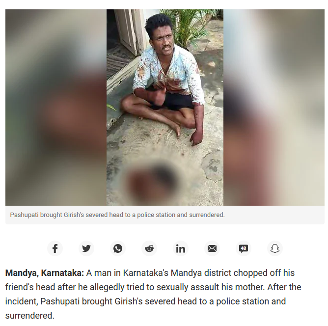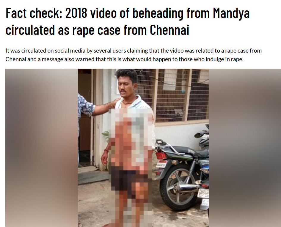 જયારે ફેક્ટ ચેક રિપોર્ટ મુજબ 2018માં કર્ણાટકના માલાવલ્લી તાલુકા ખાતે પશુપતિ નામના વ્યક્તિ દ્વારા તેમના મિત્રનું માથું કાપી પોલીસ સ્ટેશન લાવવામાં આવ્યું હતું. પશુપતિ ના કહેવા મુજબ તેમના મિત્ર ગિરીષ દ્વારા તેની માતા સાથે દુર્વ્યવહાર કરવામાં આવ્યો હતો, જે મુદ્દે રોષે ભરાઈને તેનું માથું કાપી પોલીસ સ્ટેશન તે હાજર થયો હતો.