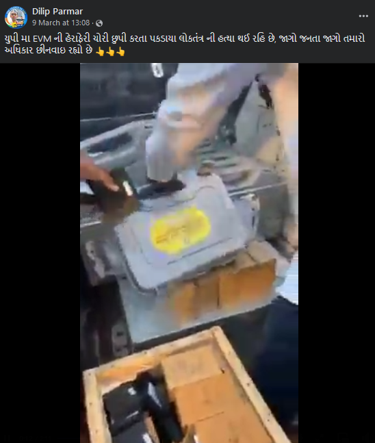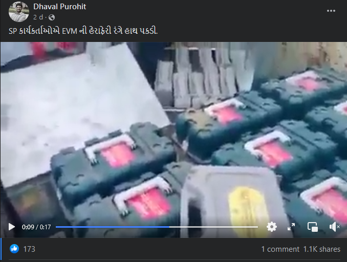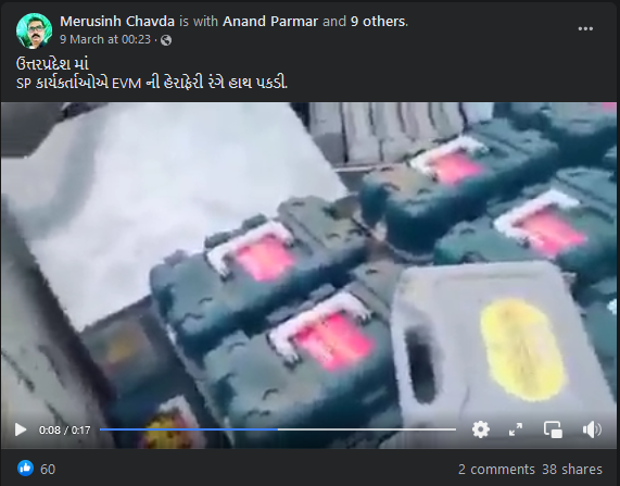 ફેસબુક પર “SP કાર્યકર્તાઓએ EVM ની હેરાફેરી રંગે હાથ પકડી.” ટાઇટલ સાથે એક વિડિઓ શેર કરવામાં આવેલ છે. વિડીઓમાં સપા કાર્યકર્તાઓ દ્વારા એક ટ્રક રોકવામાં આવ્યો હતો, જેમાં કેટલાક EVM મશીન પકડાતા સાથે સપા કાર્યકર્તાઓ દ્વારા EVM સાથે છેડછાડ થઈ હોવાનો આરોપ ચૂંટણી અધિકારીઓ પર લગાવ્યો હતો.