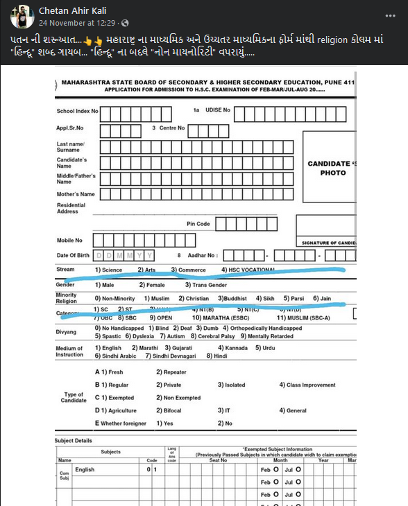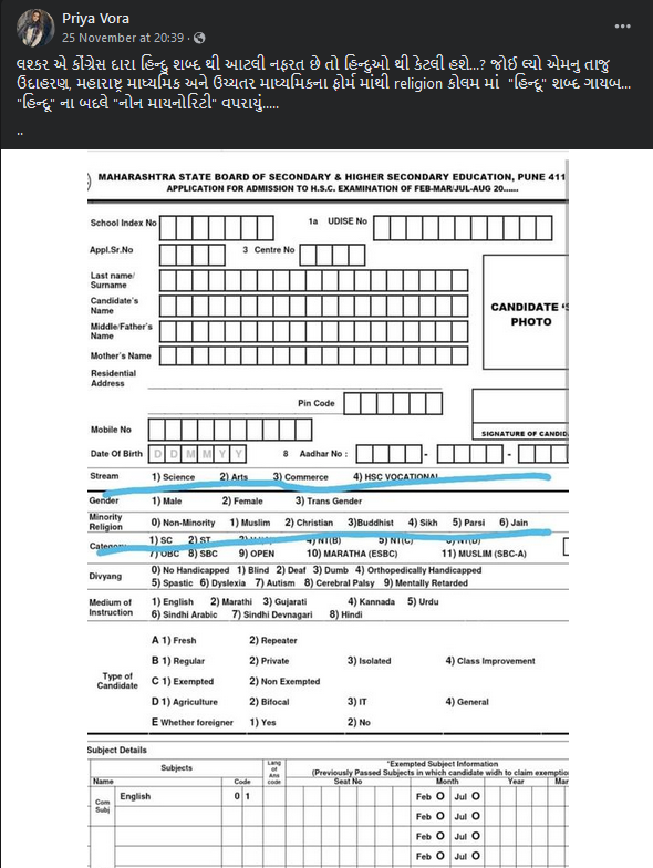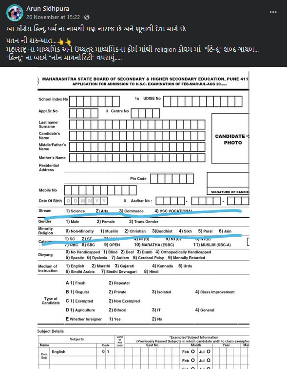 ફેસબુક પર “મહારાષ્ટ્ર ના માધ્યમિક અને ઉચ્ચતર માધ્યમિકના ફોર્મ માંથી religion કોલમ માં “હિન્દૂ” શબ્દ ગાયબ… “હિન્દૂ” ના બદલે “નોન માયનોરિટી” ટાઇટલ સાથે પરીક્ષાના ફોર્મની તસ્વીર વાયરલ થયેલ છે. યુઝર્સ દ્વારા દાવો શેર કરતા આ પગલા માટે શિવસેના સરકારને દોષી ઠેરવી અને તેમને ખરાબ ગણાવ્યા હતા.