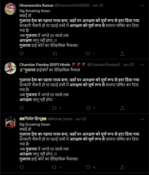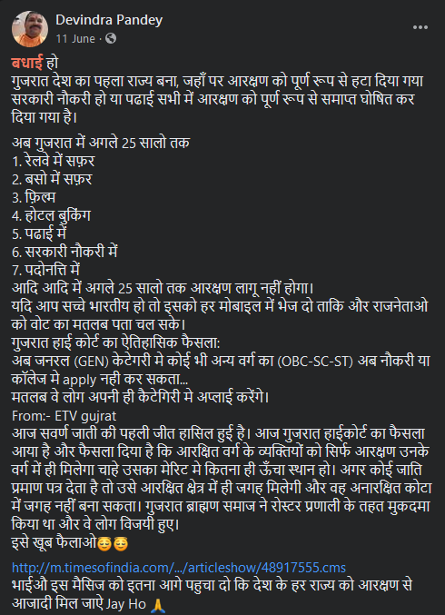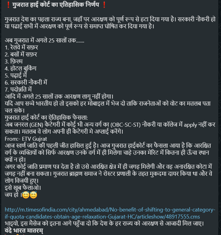 ફેસબુક અને ટ્વીટર પર timesofindia દ્વારા 2015માં પ્રકાશિત કરવામાં અહેવાલ સાથે ગુજરાત દેશનું પહેલું એવું રાજ્ય બન્યું જ્યાં આરક્ષણ નાબૂદ કરવામાં આવ્યું હોવાનો દાવો કરવામાં આવ્યો છે. તેમજ આગામી 25 વર્ષ સુધી ગુજરાતમાં સરકારી નોકરી કે શાળા-કોલેજોમાં આરક્ષણ લાગુ નહીં પડે. આ નિર્ણય ગુજરાત હાઇકોર્ટ દ્વારા લેવામાં આવ્યો છે. (reservation in state)