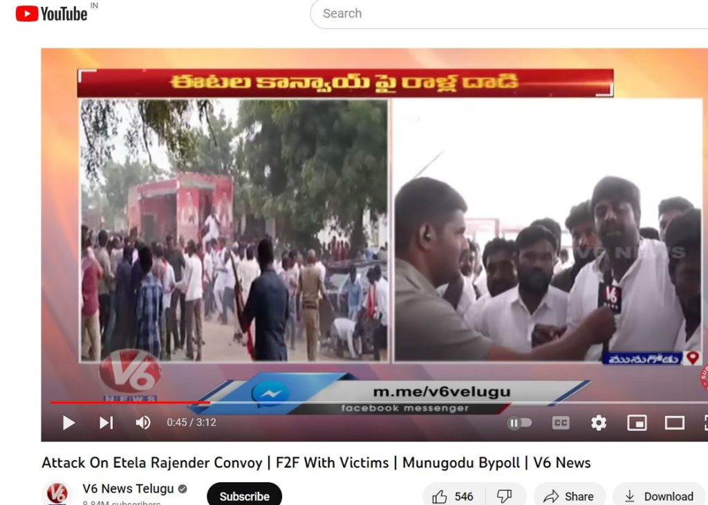 1 નવેમ્બર, 2022ના રોજ V6 ન્યૂઝ તેલુગુ દ્વારા પ્રકાશિત અહેવાલ મુજબ, મુનુગોડના પાલીવેલા ગામમાં અજાણ્યા વ્યક્તિઓએ ભાજપના કાફલા પર પથ્થરમારો કર્યો હતો. ભાજપે આરોપ લગાવ્યો કે આ હુમલા પાછળ ભારત રાષ્ટ્ર સમિતિના સભ્યોનો હાથ છે, જે અગાઉ તેલંગાણા રાષ્ટ્ર સમિતિ તરીકે ઓળખાતી હતી.