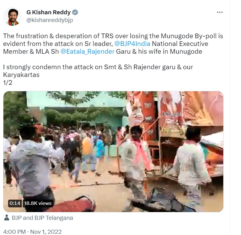 બીજેપી નેતા અને કેન્દ્રીય મંત્રી જી કિશન રેડ્ડીના 1 નવેમ્બર, 2022ના રોજ પોસ્ટ કરેલા ટ્વીટ અનુસાર આ હુમલો મુનુગોડ પેટાચૂંટણી પહેલા પ્રચાર દરમિયાન થયો હતો.