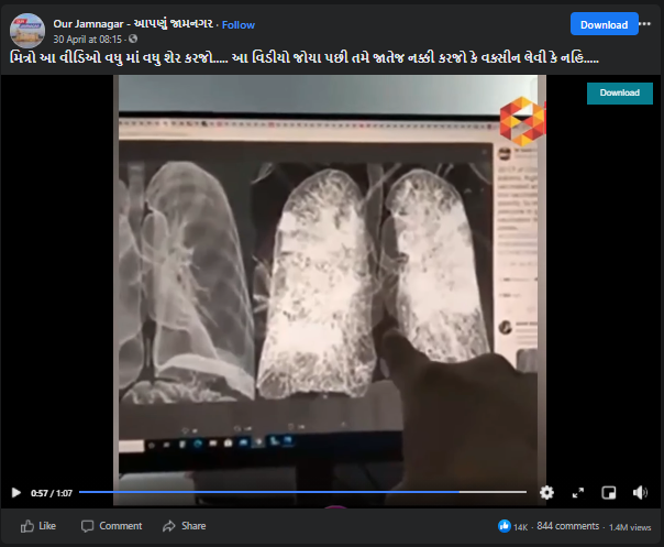 વેક્સીન લેનાર વ્યક્તિ પર કોરોના વાયરસનું સંક્રમણ અને વેક્સીન ના લેનાર વ્યક્તિ પર વાયરસની અસર મુદ્દે વાયરલ થયેલ તસ્વીર અને વિડિઓ ભ્રામક છે. વાયરલ HRCTC રિપોર્ટ પરથી માત્ર વાયરસનું સંક્ર્મણ કેટલી હદ્દ સુધુ ફેલાયું છે તે જાણી શકાય છે. Vancouver General Hospital અને University of British Columbia દ્વારા ગત વર્ષે એપ્રિલ 2020માં વાયરસનું સંક્ર્મણ કેટલી હદ્દ સુધી ફેલાયું હોવા અંગે કરવામાં આવેલ અભ્યાસ દરમિયાન પબ્લિશ કરવામાં આવેલ તસ્વીર હાલ વેક્સીન ના લેનાર વ્યક્તિના ફેફસાં ની આ હાલત થતી હોવાના ભ્રામક દાવા સાથે શેર કરવામાં આવેલ છે.