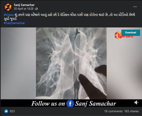ન્યુઝ સંસ્થાન સાંજ સમાચાર દ્વારા પણ આ વિડીઓ 30 એપ્રિલના ફેસબુક વોલ પર “#Video શું તમને પણ બીજાને આવું કહો છો કે વેક્સિન લીધા પછી પણ કોરોના થાઈ છે…તો આ વીડિઓ છેલ્લે સુધી જુઓ” કેપશન સાથે શેર કરવામાં આવેલ છે.