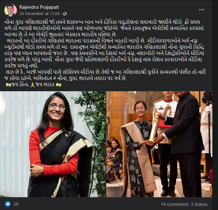 ફેસબુક યુઝરે નીના ગુપ્તાની તસ્વીર શેર કરી અને લખ્યું છે કે “નીના ગુપ્તા ગણિતશાસ્ત્રી જો તમને શાહરૂખ ખાન અને દીપિકા પાદુકોણના સમાચારો જાણીને થોડો ફ્રી સમય મળે તો આપણે ભારતીયોઓએ આમને પણ ઓળખવા જોઈએ! જેમને રામાનુજન એવોર્ડથી સન્માનિત કરવામાં આવ્યા છે, તે આ એવોર્ડ જીતનાર એકમાત્ર ભારતીય મહિલા છે.“