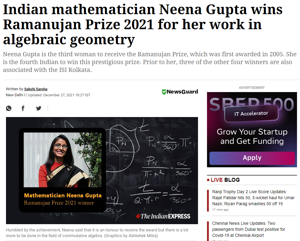 નીના ગુપ્તા દેશની પ્રથમ મહિલા ગણિતશાસ્ત્રી છે જેને પ્રતિષ્ઠિત રામાનુજન એવોર્ડ મળ્યો હોવાના દાવા અંગે ગુગલ સર્ચ કરતા નીના ગુપ્તા સાથે સંબંધિત ઘણા મીડિયા રિપોર્ટ્સ જોવા મળ્યા. વર્ષ 2021માં અંગ્રેજી અખબાર ‘ધ ઈન્ડિયન એક્સપ્રેસ‘માં પ્રકાશિત એક અહેવાલ અનુસાર, “નીના ગુપ્તાને બીજગણિત ભૂમિતિના ક્ષેત્રમાં તેમના કાર્ય માટે વર્ષ 2021 માટે પ્રતિષ્ઠિત રામાનુજન એવોર્ડ એનાયત કરવામાં આવ્યો હતો”. આ સન્માન મેળવનાર તે ચોથા ભારતીય ગણિતશાસ્ત્રી છે.