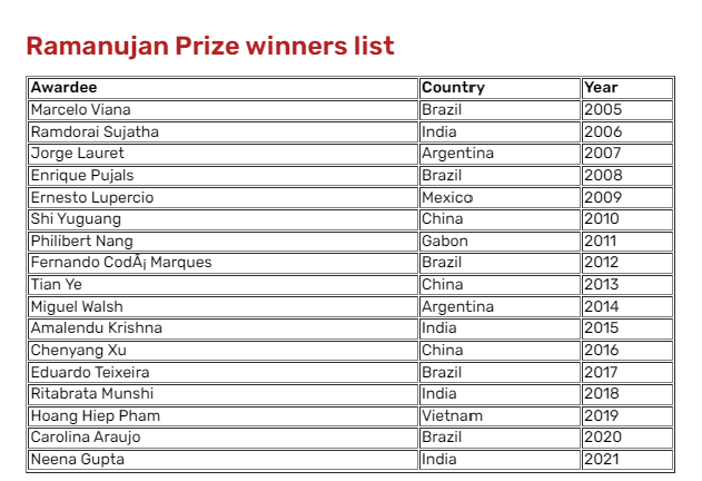 વધુ તાપસ કરવા પર અમને ઇન્ડિયા ટુડે દ્વારા પ્રકાશિત કરવામાં આવેલ અહેવાલ જોવા મળે છે. જેમાં તમામ રામાનુજન પુરસ્કાર વિજેતાઓના નામ, વર્ષ અને દેશોની યાદી આપવામાં આવેલ છે.આ રિપોર્ટ અનુસાર, વર્ષ 2005માં શરૂ થયેલ રામાનુજન પુરસ્કાર કુલ 17 લોકોએ જીત્યો છે, જેમાં 4 ભારતીય ગણિતશાસ્ત્રીઓનો સમાવેશ થાય છે.વર્ષ 2006માં, રામદોરાઈ સુજાતા આ પુરસ્કાર જીતનાર પ્રથમ ભારતીય હતા અને પ્રથમ ભારતીય મહિલા પણ હતા.