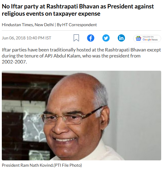 જયારે નરેન્દ્ર મોદી દ્વારા ઈફ્તાર પાર્ટી બંધ કરવવા અંગે ગુગલ સર્ચ કરતા hindustantimes દ્વારા જૂન 2018ના પોસ્ટ કરવામાં આવેલ અહેવાલ જોવા મળે છે. અહીંયા રાષ્ટ્રપતિ કોવિંદના પ્રેસ સેક્રેટરી દ્વારા આપવામાં આવેલ ભાષણ મુજબ, “રાષ્ટ્રપતિ કોવિંદે કાર્યભાર સંભાળ્યા પછી, તેમણે નિર્ણય લીધો હતો કે કરદાતાના ખર્ચ પર રાષ્ટ્રપતિ ભવન જેવી જાહેર ઇમારતમાં કોઈ ધાર્મિક ઉજવણી નહીં થાય. આ એક બિનસાંપ્રદાયિક રાજ્યના સિદ્ધાંતોને ધ્યાનમાં રાખીને લેવામાં આવેલ નિર્ણય છે અને તમામ ધાર્મિક પ્રસંગોને લાગુ પડે છે.