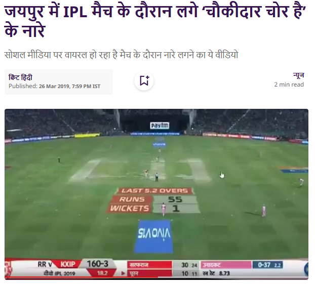 આ અંગે કેટલાક કીવર્ડ સર્ચ કરતા thequint અને bbc ન્યુઝ દ્વારા માર્ચ 2019ના પ્રકાશિત કરવામાં આવેલ અહેવાલ જોવા મળે છે. જે મુજબ, જયપુરના સવાઈ માનસિંહ સ્ટેડિયમમાં રાજસ્થાન રોયલ્સ અને કિંગ્સ ઈલેવન પંજાબ વચ્ચેની આઈપીએલ મેચ દરમિયાન ‘ચોકીદાર ચોર હૈ’ના નારા લાગ્યા હતા.