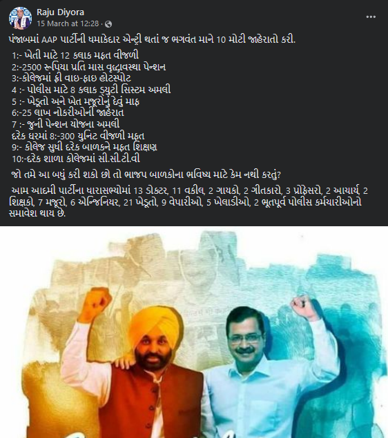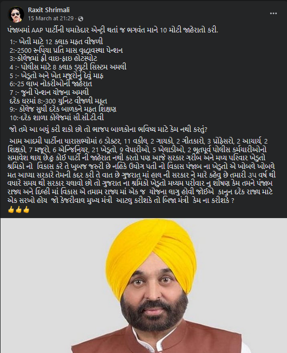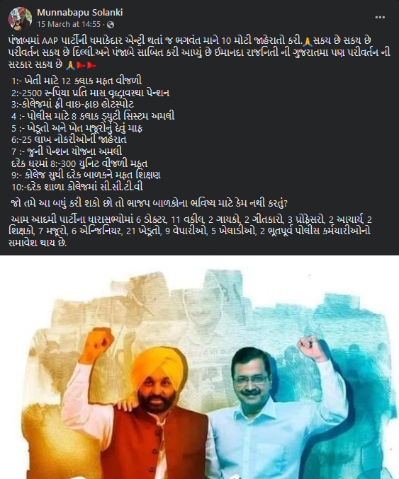ફેસબુક અને વોટસએપ પર “પંજાબમાં AAP પાર્ટીની ધમાકેદાર એન્ટ્રી થતાં જ ભગવંત માને 10 મોટી જાહેરાતો કરી.” ટાઈટલ સાથે 10 જાહેરાત અંગે માહિતી જણાવવામાં આવેલ છે. વાયરલ પોસ્ટ ગુજરાત આપ વર્કર દ્વારા ફેસબુક પર મોટા પ્રમાણમાં શેર કરવામાં આવેલ છે.