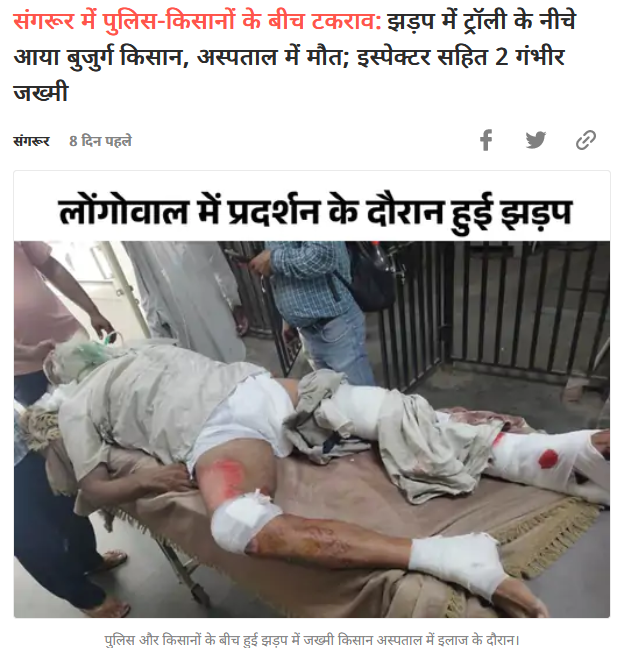 ઉપરાંત, સંગરુર પોલીસ દ્વારા આ ઘટનાને લઈને 21 ઓગષ્ટના કરવામાં આવેલ ટ્વીટ જોવા મળે છે. પોલીસે આપેલી સ્પષ્ટતા કરતા જણાવ્યું કે લોંગોવાલ ખાતે આજે એક પ્રદર્શનકારીનું કમનસીબ મૃત્યુ થયું છે. સાક્ષીઓ અને વિડિયોઝ મુજબ મૃતક વિરોધ પ્રદશન કરી રહ્યા હતા જે દરમિયાન ચાલતા ટ્રેક્ટરની ટ્રોલી ફરી વળતા એક પોલીસ ઈન્સ્પેક્ટરને પણ ગંભીર ઈજા થઈ હતી.