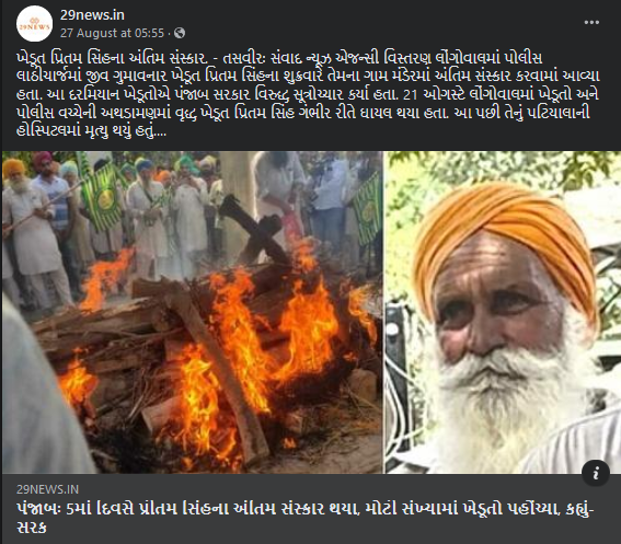 પોલીસ લાઠીચાર્જ દરમિયાન ખેડૂત પ્રિતમ સિંહનું મૃત્યુ થયું હોવાના દાવા સાથે વાયરલ થયેલ પોસ્ટ ભ્રામક છે. પંજાબના લોંગોવાલમાં વિરોધ પ્રદશન સમયે ટ્રેક્ટર ટ્રોલી પ્રીતમ સિંહ નામના ખેડૂત પર ફરી વળતા તેમનું મૃત્યુ થયું હતું. પોલીસ લાઠી ચાર્જના કારણે મૃત્યુ થયું હોવાનો દાવો તદ્દન ભ્રામક છે.