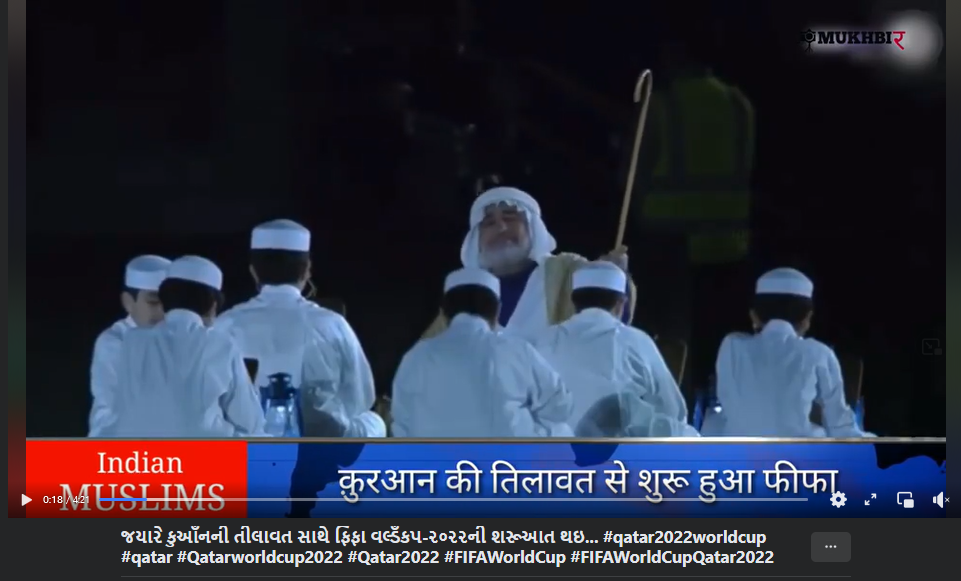 કતરમાં સ્ટેડિયમની અંદર કુરાનની આયતોનું પઠન કરતા બાળકોના આ વિડીયો સાથે દાવો કરવામાં આવી રહ્યો છે કે આ કતારમાં યોજાનાર ફિફા વર્લ્ડ કપનો ઉદ્ઘાટન સમારોહ છે, જે 20 નવેમ્બર, 2022 થી શરૂ થવાનો હતો. ફેસબુક યુઝર્સ “જયારે કુઆઁનની તીલાવત સાથે ફિફા વલ્ડઁકપ-૨૦૨૨ની શરૂઆત થઇ” ટાઇટલ સાથે વાયરલ વિડીયો શેર કરી રહ્યા છે.