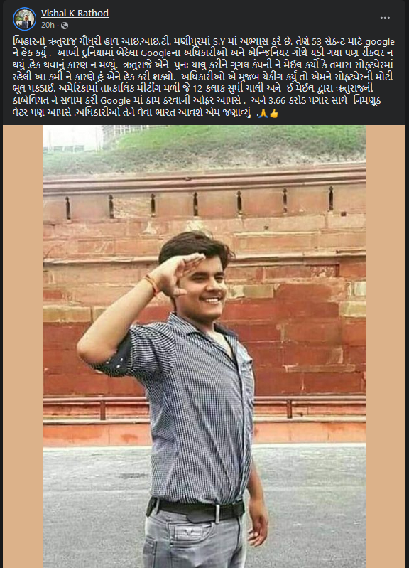 ફેસબુક પોસ્ટ સાથે “બિહારનો ઋતુરાજ ચૌધરી હાલ આઇ.આઇ.ટી. મણીપુરમાં S.Y માં અભ્યાસ કરે છે. તેણે 53 સેકન્ટ માટે google ને હેક કર્યું. ઋતુરાજની કાબેલિયત ને સલામ કરી Google માં કામ કરવાની ઓફર કરી.” ટાઇટલ સાથે ઋતુરાજ ચૌધરીની તસ્વીર શેર કરવામાં આવેલ છે. ઉલ્લેખનીય છે કે, ફેસબુક પર વાયરલ થયેલ આ ભ્રામક પોસ્ટ પર newschecker ઈંગ્લીશ ટિમ દ્વારા આગાઉ ફેકટચેક પ્રકાશિત કરવામાં આવેલ છે.