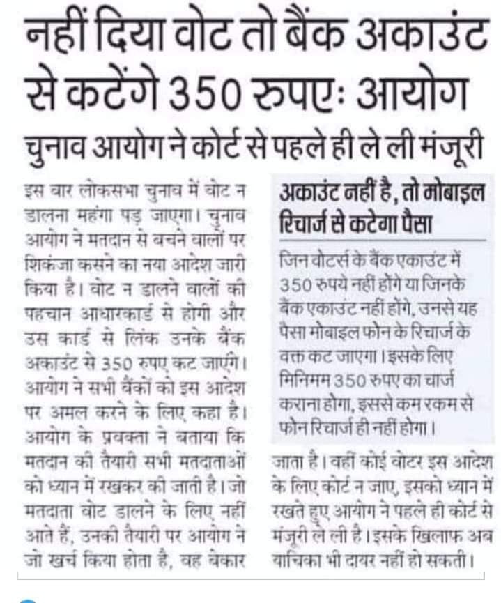 આવતા વર્ષે કેટલાક રાજ્યોમાં વિધાનસભા ચૂંટણીઓ યોજાવા જઈ રહી છે, આ ક્રમમાં સોશિયલ મીડિયા પર એક ન્યુઝ પેપરની ક્લિપિંગ શેર કરવામાં આવી છે. જેમાં દાવો કરવામાં આવ્યો છે કે, જે લોકો મતદાન નહીં કરે તેમના બેંક એકાઉન્ટ માંથી 350રૂ ચાર્જ કાપવામાં આવશે. ઉપરોક્ત દાવો સોશિયલ મીડિયા યુઝર્સ દ્વારા 2019થી અવાર-નવાર શેર કરવામાં આવેલ છે.