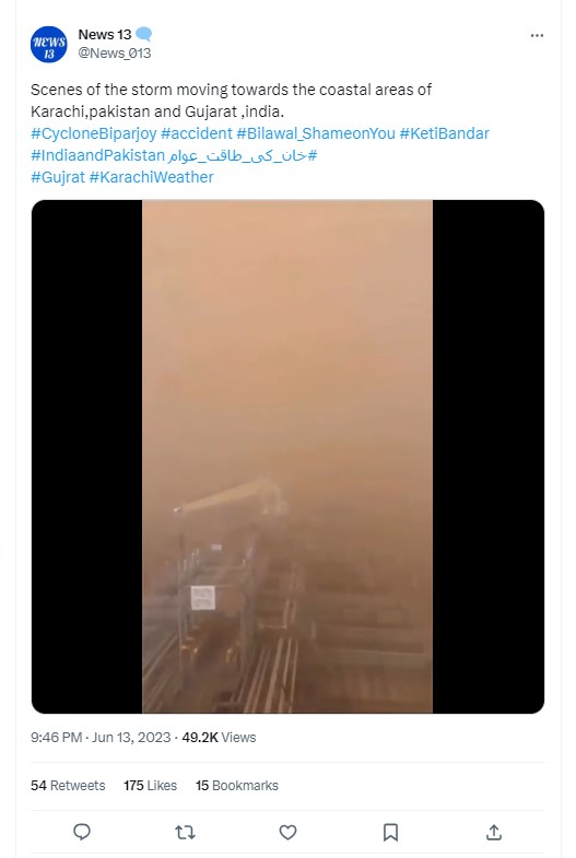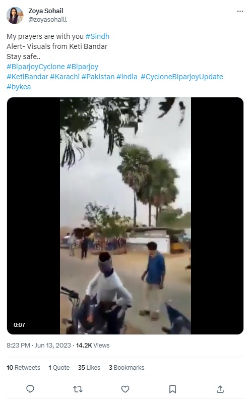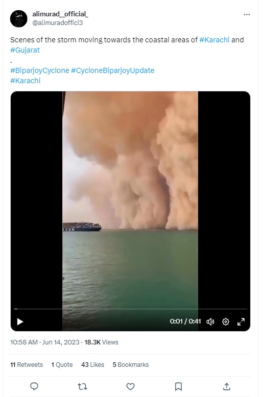 બિપરજોય વાવાઝોડાના સંદર્ભમાં અન્ય એક વિડીયો વાયરલ થઈ રહ્યો છે. જેમાં સમુદ્રની સપાટી પર પ્રચંડ રેતીના તોફાનના દર્શ્યો જોવા મળે છે. ટ્વિટર યુઝર્સ આ વાવાઝોડું કરાચી અને ગુજરાતના દરિયાકાંઠાના વિસ્તારો તરફ આગળ વધી રહ્યું હોવાના દાવા સાથે શેર કરવામાં આવેલ છે.