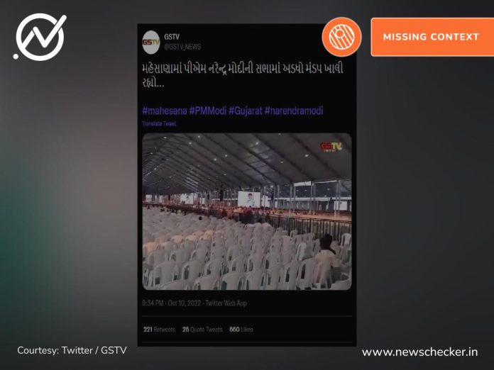 પ્રધાનમંત્રી મોદી ગુજરાત વિધાનસભા ચૂંટણીના સંદર્ભમાં રાજ્યમાં અનેક સભાઓ અને રોડ-શો કરી રહ્યા છે. હાલમાં પીએમ મોદીએ મોઢેરા સૂર્યમંદિર ખાતે કેટલાક ખાત મુહૂર્ત અને લોકાર્પણ કાર્યક્રમમાં હાજરી આપી હતી. આ ક્રમમાં સોશ્યલ મીડિયા પર મોઢેરા ખાતે પીએમ મોદીની એક જનસભામાં ખાલી ખુરશીઓ જોવા મળી હોવાનો વિડીયો વાયરલ થયો છે. વધુ વાંચો..