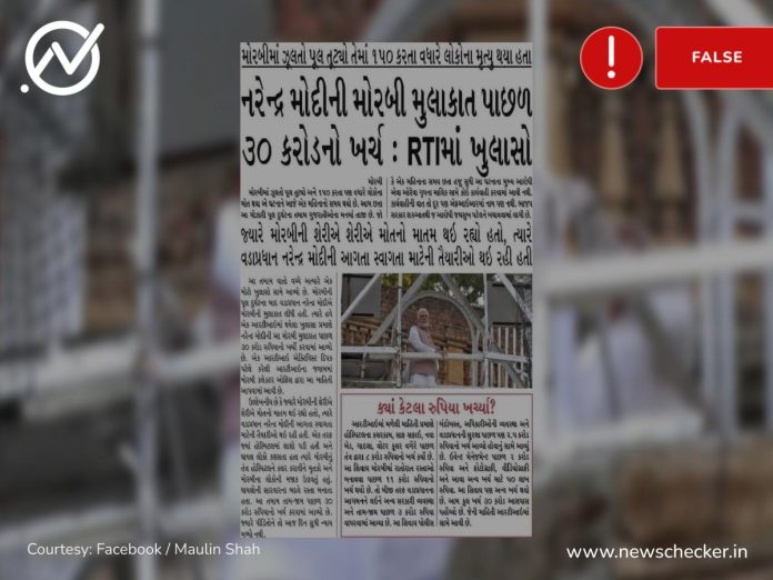 ગુજરાત વિધાનસભા ચૂંટણીનું આજે બીજા તબક્કાનું મતદાન ચાલી રહ્યું છે. પીએમ મોદીએ આજે અમદવાદના રાણીપ ખાતે વહેલી સવારે મતદાન કર્યું હતું. બીજી તરફ મોરબી ખાતે બ્રિજ તૂટી પડવાની દુઃખદ ઘટનાને પણ થોડા દિવસો જ થયા છે. સોશ્યલ મીડિયા પર એક ન્યુઝ પેપર કટિંગ વાયરલ થઈ રહ્યું છે અને દાવો કરવામાં આવ્યો છે કે નરેન્દ્ર મોદીની મોરબી મુલાકાત પાછળ 30 કરોડ રૂપિયાનો ખર્ચ થયો છે. વધુ વાંચો..