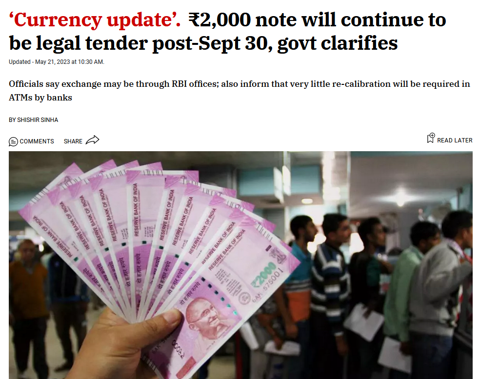MyGovIndia, ભારત સરકારના અધિકૃત નાગરિક જોડાણ પ્લેટફોર્મ દ્વારા 21મેં ના ટ્વીટ કરતા જણાવ્યું હતું કે રૂ. 2000 ની નોટ 30 સપ્ટેમ્બર, 2023 પછી પણ લીગલ ટેન્ડર તરીકે ચાલુ રહેશે.