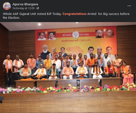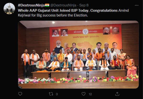 આપ ગુજરાત યુનિટ ભાજપ સાથે જોડાયું હોવાના દાવા સાથે વાયરલ થયેલ ટ્વીટર પોસ્ટ પર ભ્રામક દાવો કરવામાં આવેલ છે. થોડા દિવસો અગાઉ સુરત, જૂનાગઢ, નવસારી અને વડોદરા જિલ્લાના 250થી વધુ AAP Gujarat યુનિટ ભાજપ સાથે જોડાયું હોવાના દાવા સાથે વાયરલ થયેલ ટ્વીટર પોસ્ટ પર ભ્રામક દાવો કરવામાં આવેલ છે. સુરત, જૂનાગઢ, નવસારી અને વડોદરા જિલ્લાના 250થી વધુ આપ કાર્યકર્તા ભાજપ સાથે જોડાયા હતાઆપ કાર્યકર્તા ભાજપ સાથે જોડાયા હતા, આ માહિતીને સંપૂર્ણ આપ ગુજરાત યુનિટ જોડાયું હોવાના ભ્રામક ટાઇટલ સાથે ટ્વીટર પર શેર કરવામાં આવેલ છે.