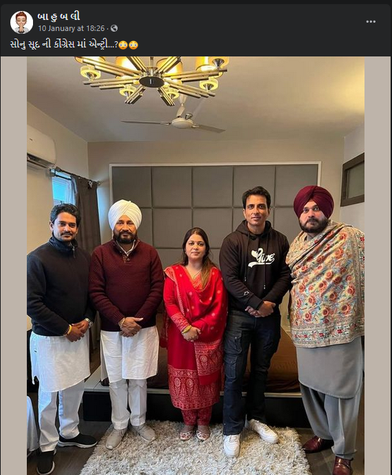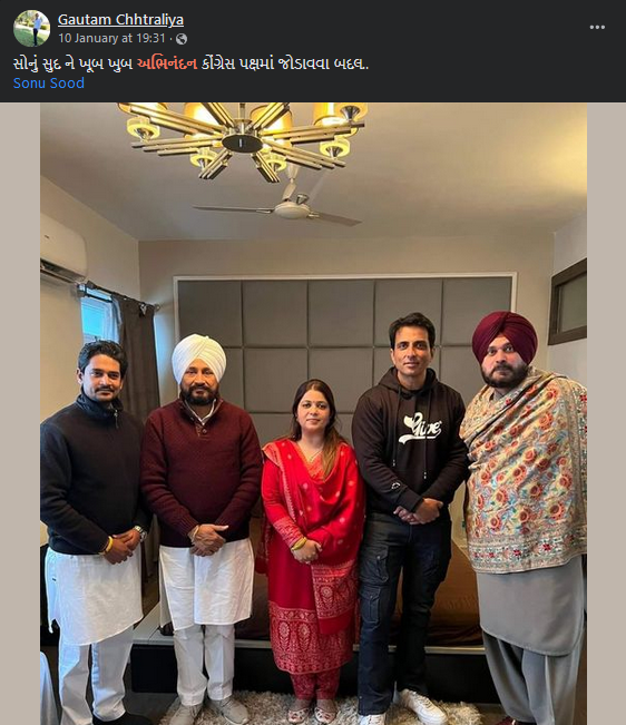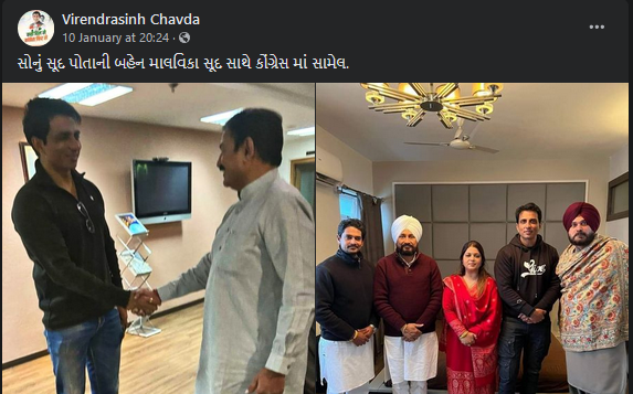 ફેસબુક પર “સોનું સુદ ને ખૂબ ખુબ અભિનંદન કોંગ્રેસ પક્ષમાં જોડાવવા બદલ” અને “સોનું સૂદ પોતાની બહેન માલવિકા સૂદ સાથે કોંગ્રેસ માં સામેલ” ટાઇટલ સાથે સોનુ સૂદ અને તેમની બહેન માલ્વિકા તેમજ પંજાબ CMની તસ્વીર શેર કરવામાં આવેલ છે. સોશ્યલ મીડિયા પર સોનુ સૂદ કોંગ્રેસ પાર્ટીમાં જોડાયા હોવાના દાવા સાથે ગુજરાત કોંગ્રેસ નેતા ભરતસિંહ સોલંકી દ્વારા પણ પોસ્ટ શેર કરવામાં આવેલ છે.