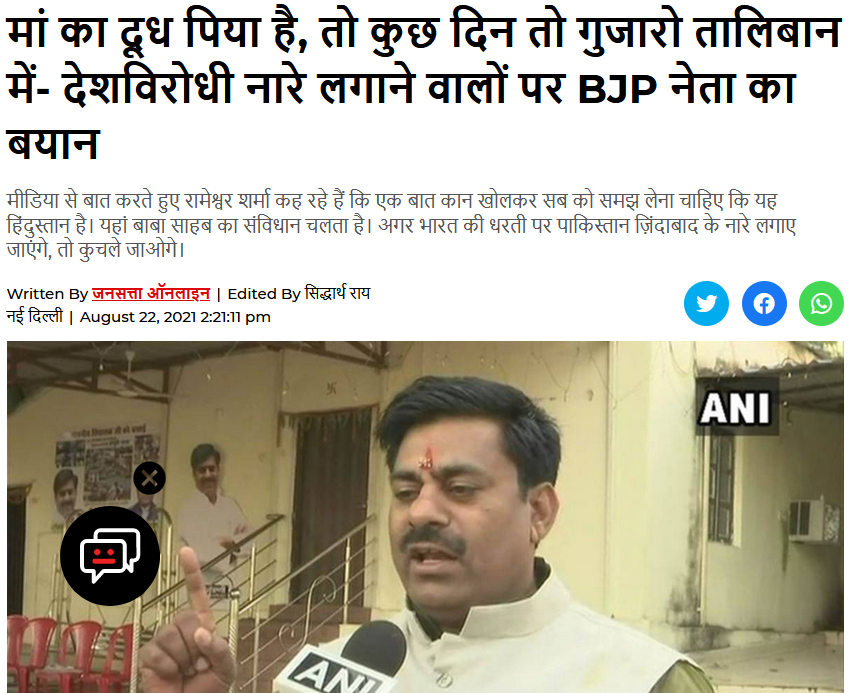 આસામના મુખ્યમંત્રી દ્વારા ઉજ્જૈનમાં પાકિસ્તાન ઝિંદાબાદના નારા લાગ્યાની ઘટના પર આક્રમક ટિપ્પણી કરવામાં આવી હોવાનો ભ્રામક વિડિઓ વાયરલ થયેલ છે. ‘દેશ વિરોધી નારા લગાવનાર થોડા દિવસો તાલિબાન કે અફઘાનિસ્તાનમાં રહેવા જઈ શકે છે’ ટિપ્પણી સાથે વાયરલ થયેલ વિડિઓમાં દેખાતા વ્યક્તિ મધ્યપ્રદેશના ભાજપ નેતા રામેશ્વર શર્મા છે. જયારે આસામના મુખ્યમંત્રીનું નામ ડો.હેમંતા બિસ્વા શર્મા છે.
