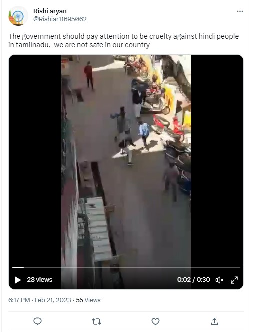 તમિલનાડુમાં હિન્દી ભાષી કામદારો પરના હુમલાનો દાવો કરતો બીજો વિડિયો જેમાં વ્યસ્ત રસ્તા પર ત્રણ લોકો દ્વારા એક વ્યક્તિની હત્યા કરવામાં આવે છે.