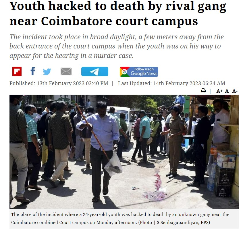વાયરલ વિડિયોમાંથી સ્ક્રીનગ્રેબ લઈને, અહેવાલમાં જણાવાયું છે કે, “ચાર સભ્યોની ટોળકીએ કોઈમ્બતુરમાં જિલ્લા કોર્ટ સંકુલ પાસે સંપૂર્ણ જાહેરમાં એક વ્યક્તિની હત્યા કરી હતી. આ ઘટના અંગે અનેક અન્ય સમાચાર આઉટલેટ્સે અહેવાલ પ્રકાશિત કરેલા છે, જો કે આવા કોઈ પણ અહેવાલમાં હિન્દી ભાષી વ્યક્તિ પર તમિલ લોકો દ્વારા હુમલો કરવામાં આવ્યો હોવાનો ઉલ્લેખ કરવામાં આવ્યો નથી. અહેવાલો અહીં , અહીં , અને અહીં જોઈ શકાય છે .