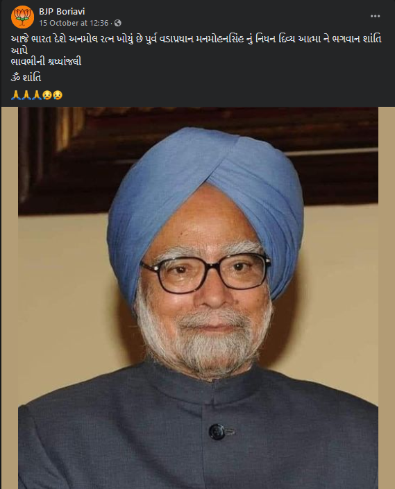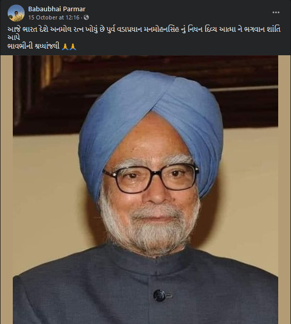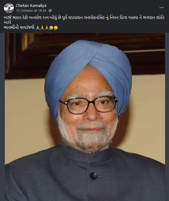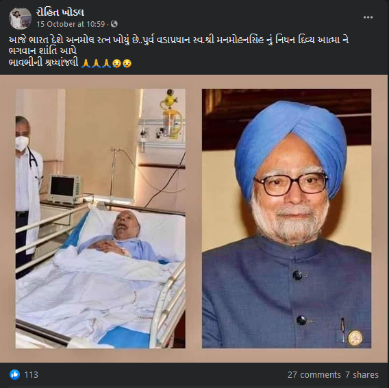 15 ઓક્ટોબરના કેટલાક ફેસબુક યુઝર્સે “આજે ભારત દેશે અનમોલ રત્ન ખોયું છે પુર્વ વડાપ્રધાન ડો.મનમોહન સિંહનું નિધન નિધન દિવ્ય આત્મા ને ભગવાન શાંતિ આપે” ટાઇટલ સાથે ડો.મનમોહન સિંહની તસ્વીર શેર કરી હતી. આ કોઈ પ્રથમ વખત નથી, જ્યારે કોઈ મોટા રાજકારણી અથવા સેલિબ્રિટીના હોસ્પિટલમાં દાખલ થયા બાદ તેમના વિશે ખોટા સમાચાર ફેલાવવામાં આવ્યા છે. ભૂતકાળમાં પણ newschecker દ્વારા આવા કેટલાક ભ્રામક દાવાઓની તપાસ કરવામાં આવી છે, જે અહીં વાંચી શકાય છે.