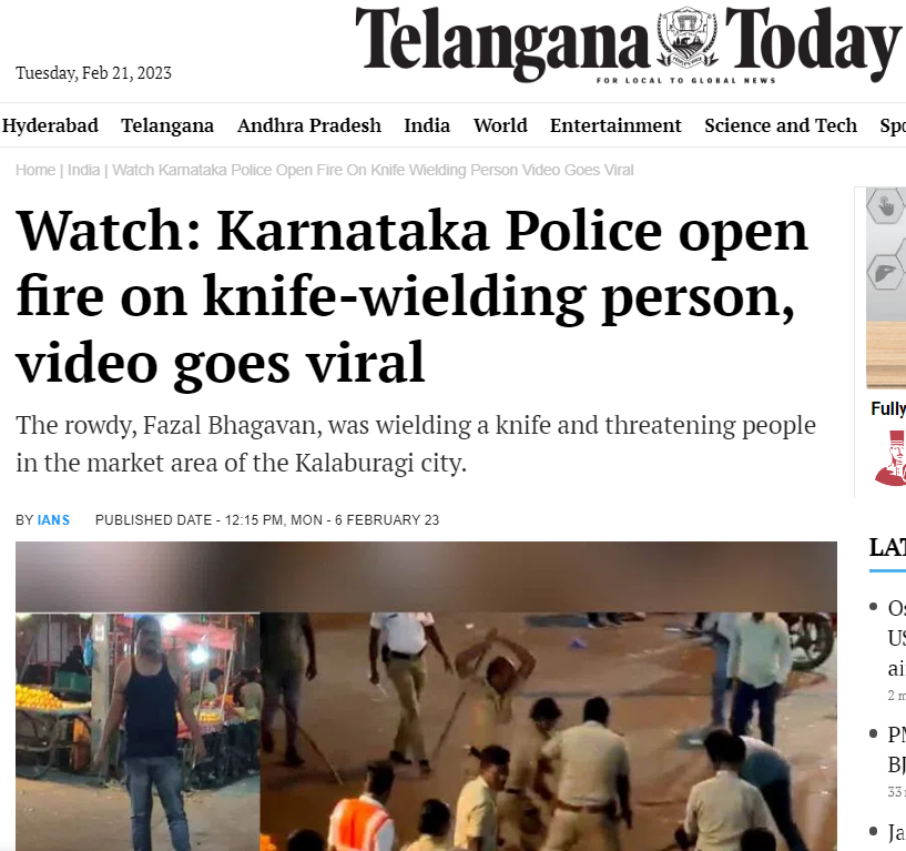 ઈન્ડિયા ટુડેના સમાચાર અનુસાર, કર્ણાટકના ફઝલ ભગવાન નામનો વ્યક્તિ કલબુર્ગીના એક માર્કેટમાં સામાન્ય લોકોને છરી બતાવીને ધમકી આપી રહ્યો હતો. માહિતી મળતા જ પોલીસ બજારમાં પહોંચી અને વ્યક્તિને રોકવાનો પ્રયાસ કર્યો. આ વ્યક્તિએ પોલીસ પર પણ હુમલો કરવાનો પ્રયાસ કર્યો હતો. દરમિયાન, સ્વબચાવ માટે, પોલીસે વ્યક્તિને ગોળી મારીને ઘાયલ કર્યો. બાદમાં આરોપીને હોસ્પિટલમાં મોકલવામાં આવ્યો હતો.