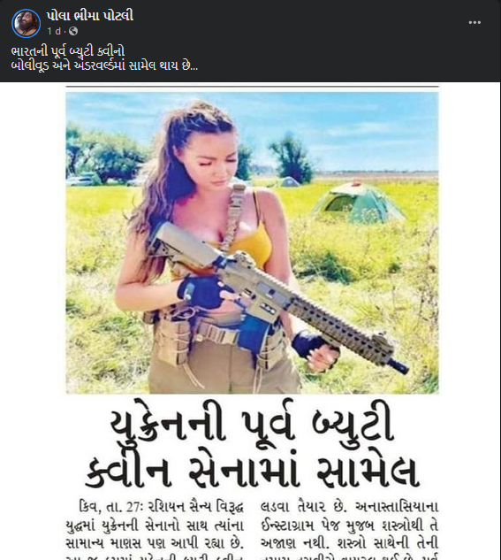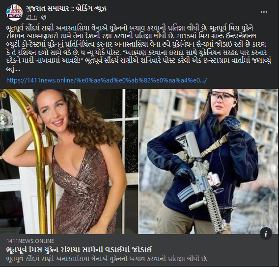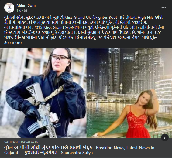 ફેસબુક પર “2015માં મિસ ગ્રાન્ડ ઈન્ટરનેશનલ બ્યુટી કોન્ટેસ્ટમાં યુક્રેનનું પ્રતિનિધિત્વ કરનાર અનાસ્તાસિયા લેના હવે યુક્રેનિયન સૈન્યમાં જોડાઈ રહી છે” ટાઇટલ સાથે અનાસ્તાસિયા લેનાની તસ્વીર શેર કરવામાં આવેલ છે. નોંધનીય છે કે વાયરલ પોસ્ટ કેટલાક ન્યુઝ ચેનલ તેમજ ન્યુઝ પેપર દ્વારા પણ પ્રકાશિત કરવામાં આવેલ છે.