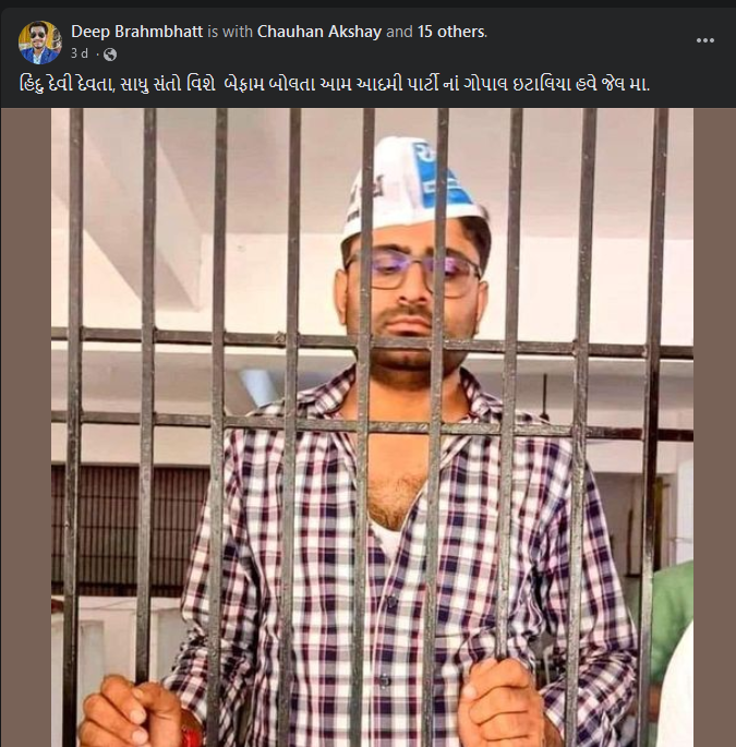 આ ઉપરાંત, કેટલાક અન્ય સોશિયલ મીડિયા યુઝર્સે “હિંદુ દેવી દેવતા, સાધુ સંતો વિશે બેફામ બોલતા આમ આદમી પાર્ટી નાં ગોપાલ ઇટાલિયા હવે જેલ મા.” ટાઇટલ સાથે ઈટાલિયાની તસ્વીર શેર કરી રહ્યા છે.